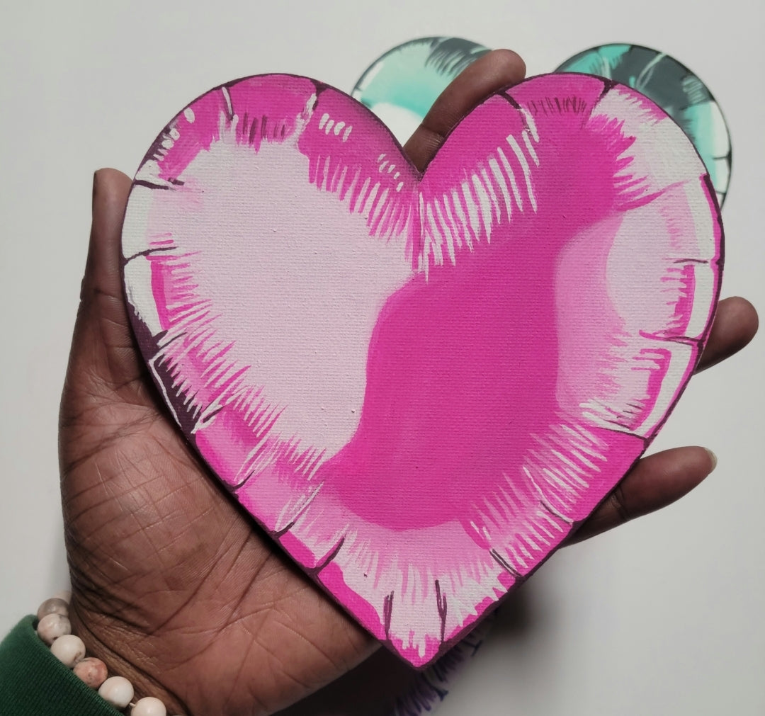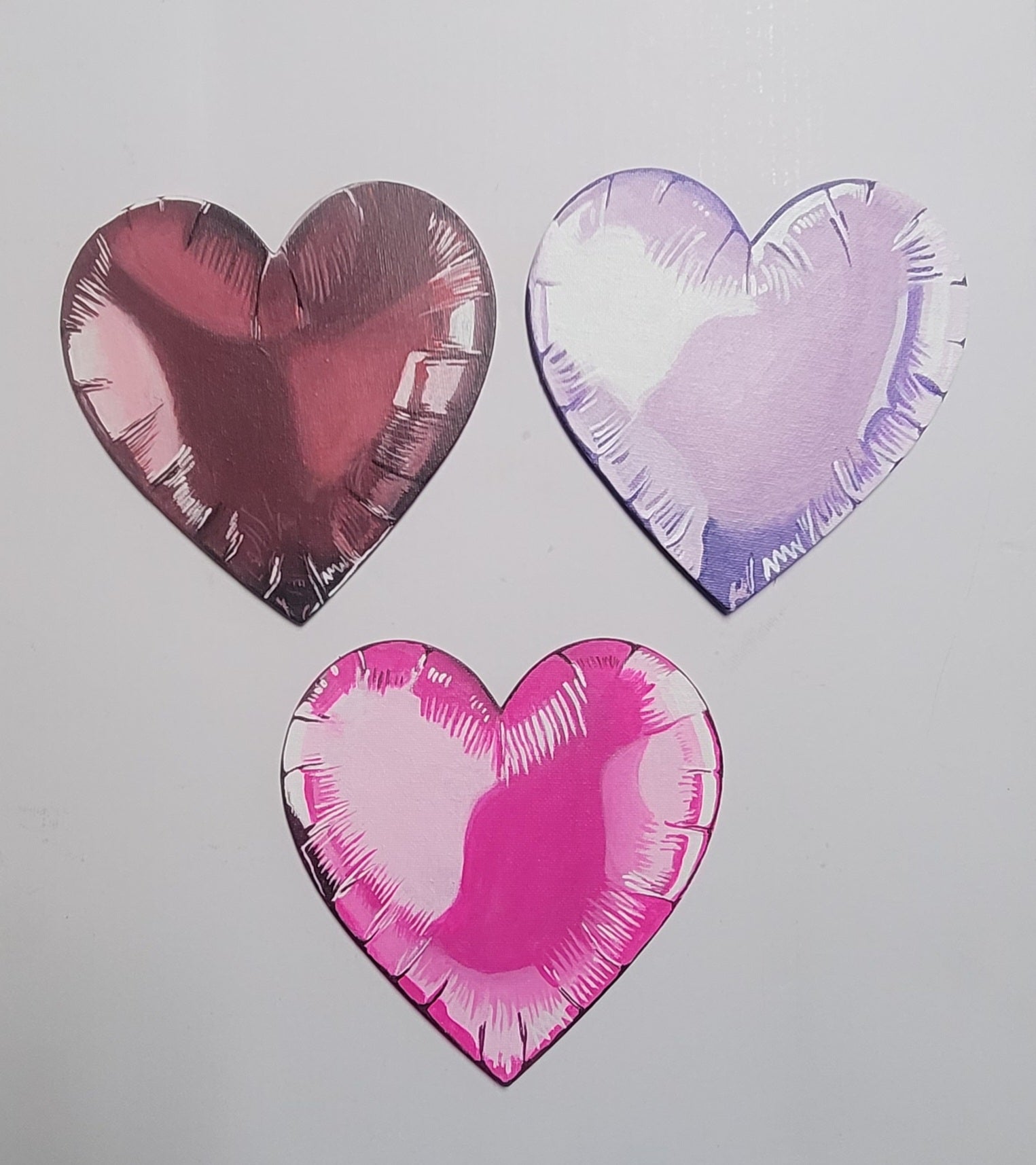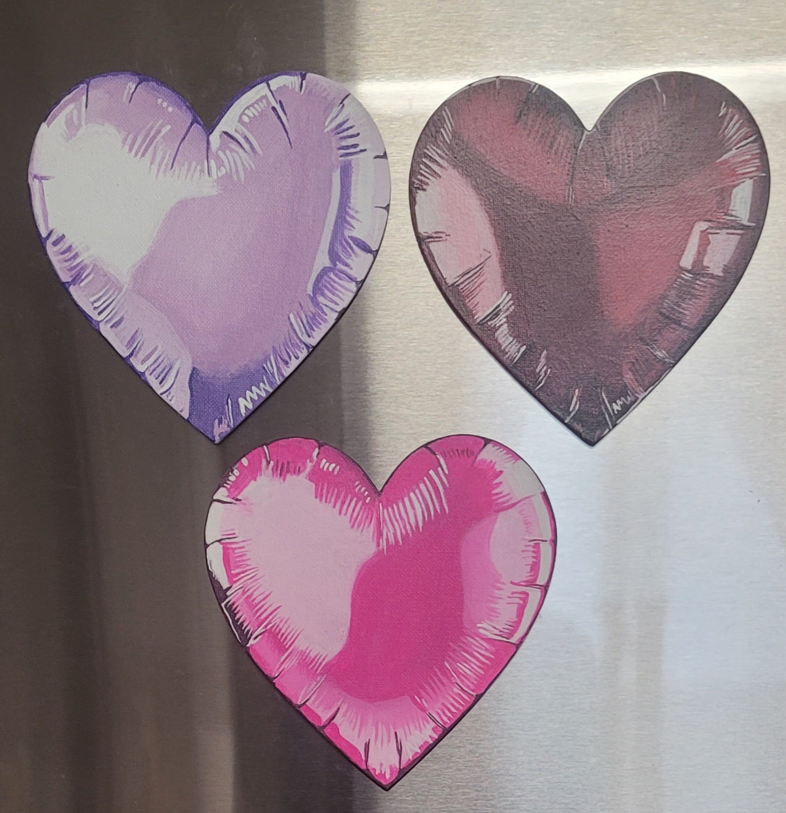 Add a whimsical pop of color to your space with this charming set of three hand-painted heart-shaped magnets, designed to look like floating balloons. Each magnet is individually crafted on a 6"x6" base and painted with love, making them a playful yet artistic addition to your fridge, office, or any magnetic surface.